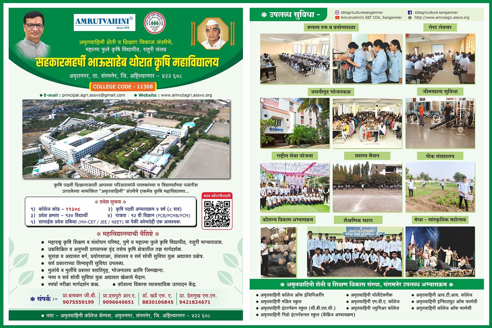 Sahakarmaharshi Bhausaheb Thorat college of Agriculture, Amrutnagar, Tal. Sangamner established in 2023 under the reminiscence of Hon. Late. Bhausaheb Thorat and under the leadership and guidance of Hon. Shri. Balasaheb Thorat, Ex-Revenue Minister, Government of Maharashtra and Hon. Dr. Sudhir Tambe (Ex-MLC Nashik).